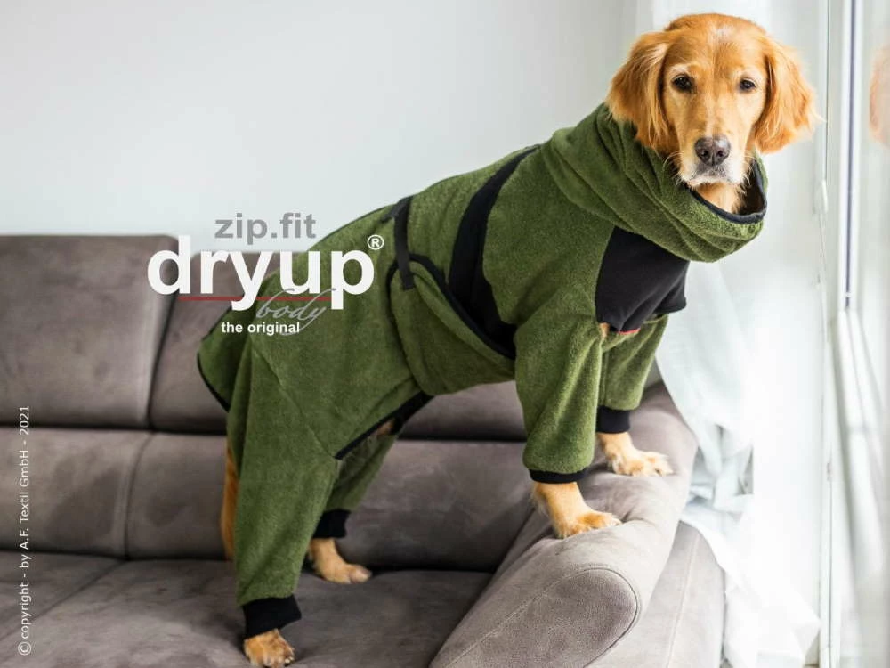 Wenn dein Hund nur leicht schmutzig und nass ist kannst du, auch ohne Duschen oder Baden, ihm einfach den Dryup Body überziehen. Neben der Feuchtigkeit bindet er nämlich auch den Schmutz der sich im Fell befindet. Dieser Schmutz kann dann aus dem trockenen Body einfach ausgeschüttelt werden und liegt deshalb nicht auf dem Boden in deinem Wohnzimmer oder im Auto.