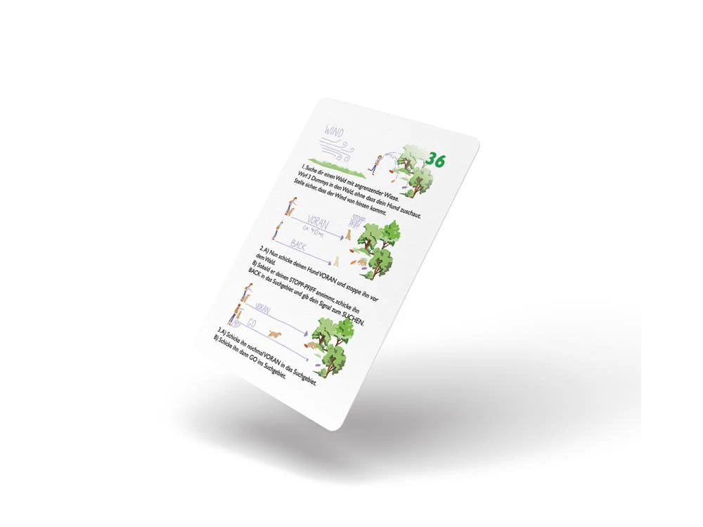 Auf 30 weiterführenden Karten im Westentaschenfreundlichen Format von 120 x 80 mm findest du zahlreiche Übungen aus dem Bereich Dummysport, die du einfach und in der Regel ohne Hilfsperson beim Spaziergang umsetzen kannst.