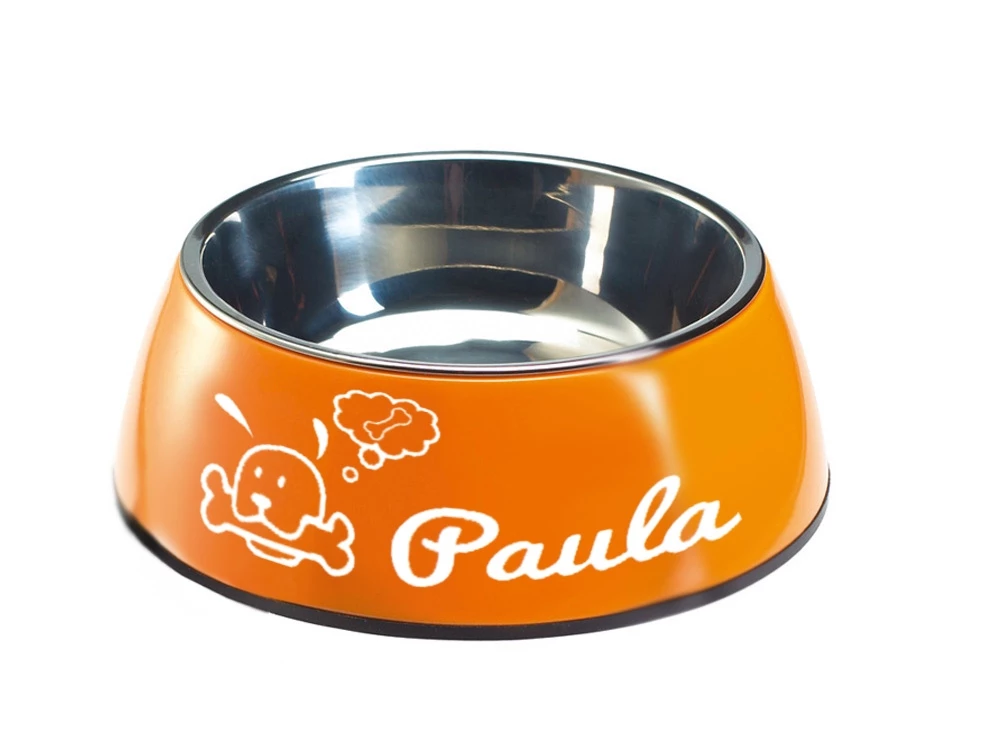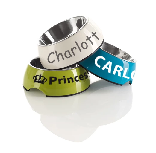 Der edle und innovative Melamin Hundenapf mit Edelstahleinsatz wird mit Deiner Wunschbeschriftung, z.B. dem Namen Deines Hundes veredelt.