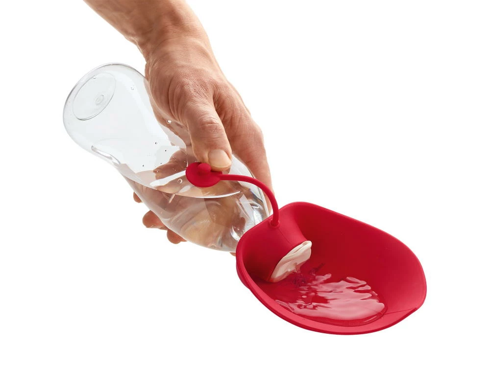 Den integrierten Wassernapf aus Silikon einfach ausklappen, in die passende Form biegen und durch Druck auf die Flasche füllen. Besonders praktisch: Der Verschluss mit Silikonnapf kann auch auf andere handelsübliche Flaschen geschraubt werden.