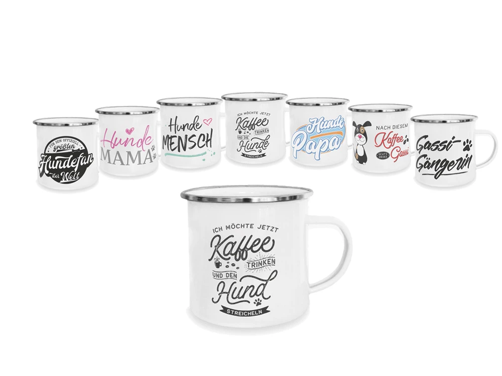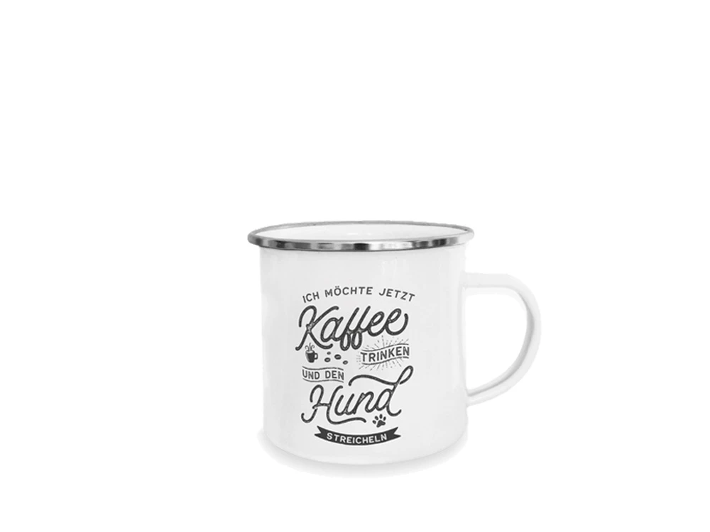 Pfotenschild Emaille-Tasse Kaffee trinken Hund streicheln