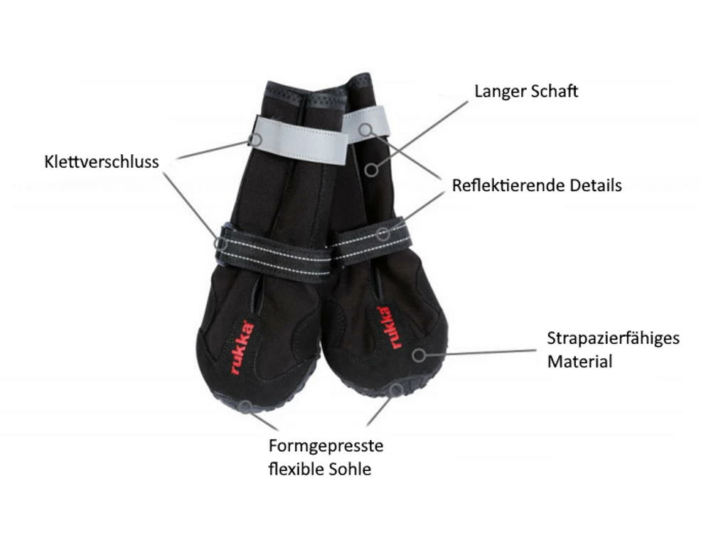 Die Rukka Pets Hundeshuhe sind ein strapazierfähiger Pfotenschutz für den intensiven Gebrauch. Bei Verletzungen oder auf Wanderungen sowie im Hundesport brauchen unsere Hunde einen robusten Schutz an den Pfoten.