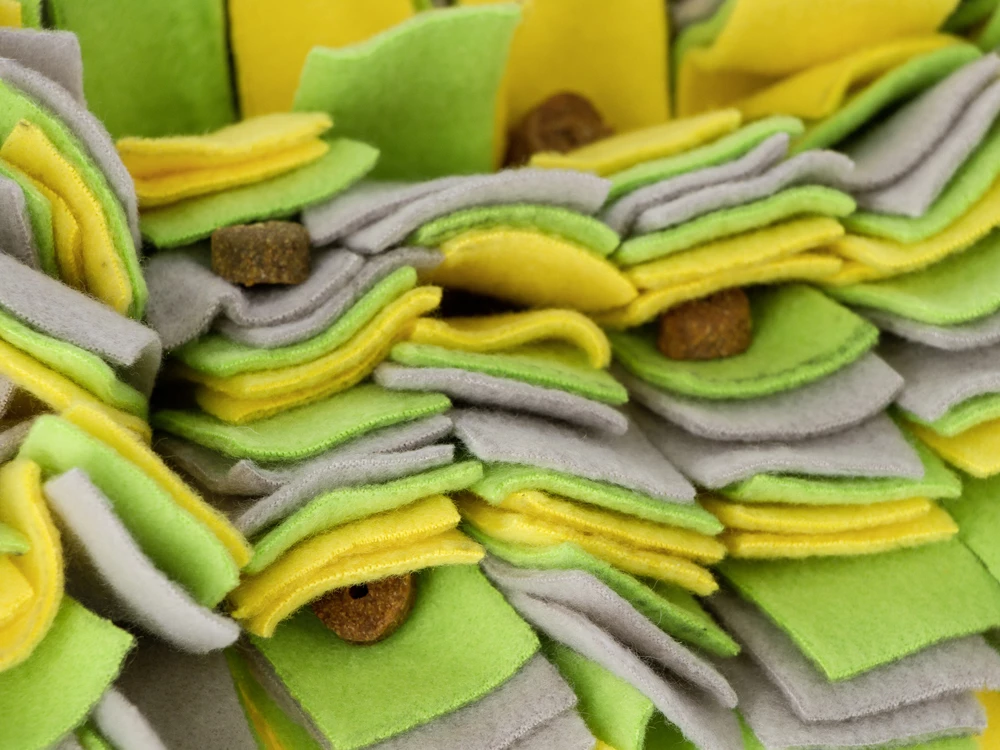 Aus unzähligen Filzstreifen zusammengesetzt ist es eine echte Herausforderung für deinen Hund die Leckerchen aufzuspüren, und der Schnüffelwiese zu entlocken. Bei Erfolg ist das gefundenen Leckerchen natürlich die Belohnung für deinen Hund. Wetten dein Hund weiß das ? 😉