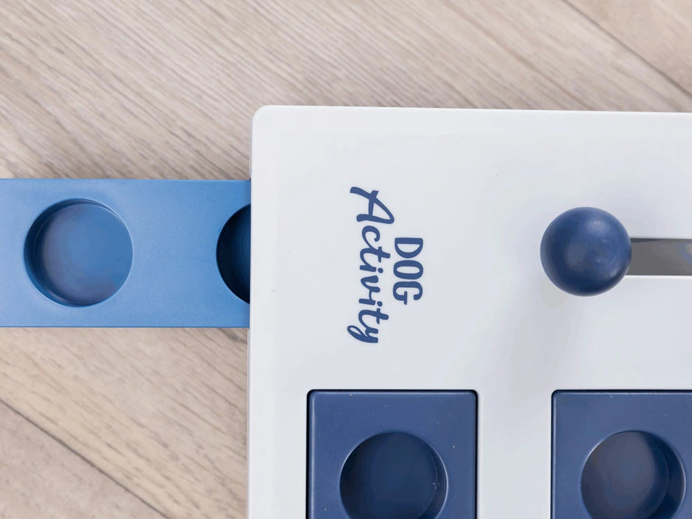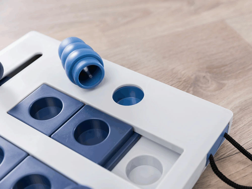 Durch Öffnen der Schubfächer mithilfe der Schlaufen bzw. abwechselndes Bewegen der Kegel und Schieber gelangt dein Hund an seine Belohnung. Durch Nutzung der Kegel als Stopper steigerst du zusätzlich den Schwirigkeitsgrad.