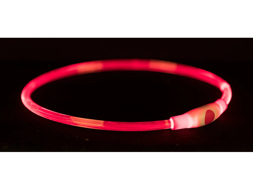 Der Flash Leuchtring aus ungiftigem TPU-Kunststoff wird einfach über ein mitgeliefertes Kabel aufgeladen. Per Knopfdruck kannst Du das Licht bei Bedarf auf Blinklicht, Dauerlicht oder ausschalten.