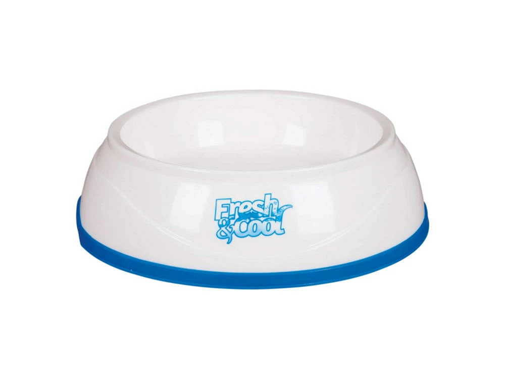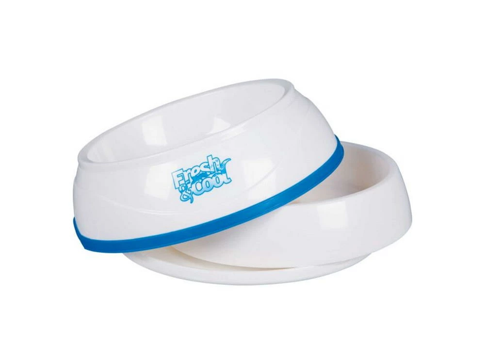 Der Kühlnapf Fresh & Cool schafft hier Abhilfe: Einfach den abnehmbaren Kühlakku einfrieren und bei Bedarf an den Napf stecken. So bleibt Wasser oder Futter lange frisch und kühl.